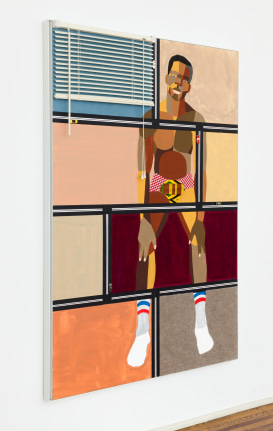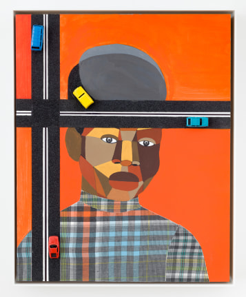 Acrylic, graphite, ink, fabric on paper collage, grip tape, and model cars on wood panel